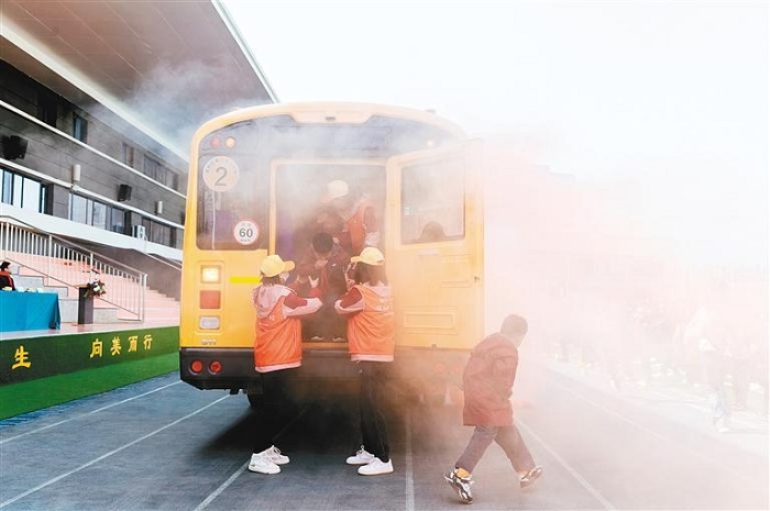 記者在演練現(xiàn)場看到,當“火情”發(fā)生時,乘坐在校車上的30名學生順著照管員的手勢,一手用衣袖捂住口鼻,一手抱頭彎腰,迅速從前后車門緊張有序撤離到安全區(qū)域,隨后由照管員清點人數(shù),檢查學生身上是否受傷,確保救援工作沒有遺漏。預警、疏散、滅火……整個過程有條不紊,用時不到3分鐘。