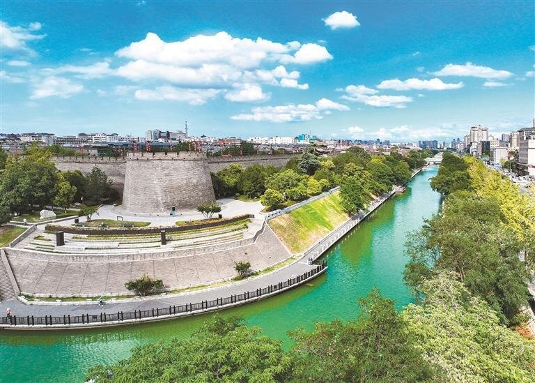 7月23日,天氣晴好,藍天白云輕柔地“覆蓋”在雄偉的古城墻與碧波蕩漾的護城河之上,為西安增添了一抹詩意與雅致。 (記者 王健 實習生 付子涵 攝)