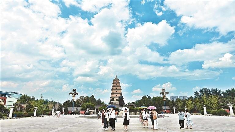 7月23日,古城西安迎來晴好天氣,在湛藍(lán)天空與如絮白云的映襯下,大雁塔更顯莊重恢弘?! 。ㄓ浾?竇翊明 攝)