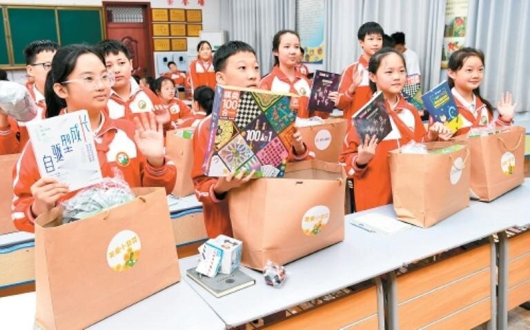 9月5日,由共青團(tuán)西安市委、西安市青年聯(lián)合會(huì)聯(lián)合主辦的“關(guān)愛小葵花”捐贈(zèng)儀式,在西安市臨潼區(qū)驪山中心小學(xué)順利舉行。愛心企業(yè)核桃編程現(xiàn)場捐贈(zèng)了價(jià)值22萬余元的學(xué)習(xí)用品與書籍,并開展“人工智能與編程”主題科普課,播撒創(chuàng)新的種子,點(diǎn)亮學(xué)生的科技?jí)粝搿D為孩子們收到愛心大禮包。(首席記者 翟小雪攝)
