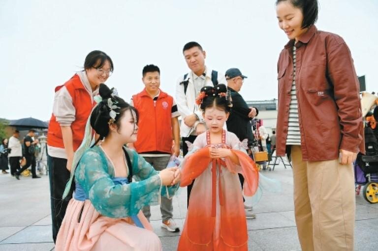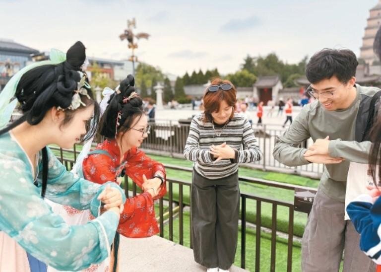 9月26日,來(lái)自西安市文明旅游志愿服務(wù)總隊(duì)的志愿者身著漢服走上街頭,向游客們講解中華傳統(tǒng)禮儀文化,解鎖“拱手禮”的正確方式。當(dāng)日,由西安市民游客服務(wù)中心與西安音樂學(xué)院聯(lián)合主辦的“詩(shī)里長(zhǎng)安·風(fēng)雅盛唐”主題文化活動(dòng)在西安市民游客中心舉行。活動(dòng)讓傳統(tǒng)文化走出書本,成為可感可觸的生活體驗(yàn),提前為雙節(jié)假期增添了獨(dú)特的文化韻味。 ?。ㄎ靼踩?qǐng)?bào) 記者 李欣 攝)