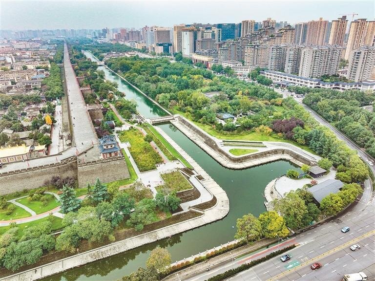 10月22日,深秋時節(jié),護城河畔水清岸綠,西安城墻在綠植環(huán)繞下更顯恢弘。 (西安日報 記者 竇翊明 攝)