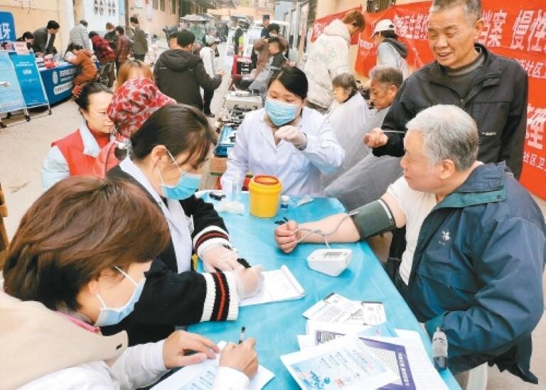 圖為醫(yī)護人員現(xiàn)場為居民測量血壓?! 。ㄓ浾摺±蠲鳌z)