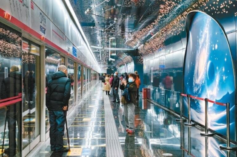 近日,西安地鐵15號線皇子坡站成為熱門打卡點,獨特的設計風格吸引眾多市民前來體驗、拍照。站內深藍色穹頂綴滿“星辰”,搭配航天壁畫打造出如夢似幻的乘車環(huán)境。 ?。ㄎ?圖 西安日報 記者 郝鐘毓)