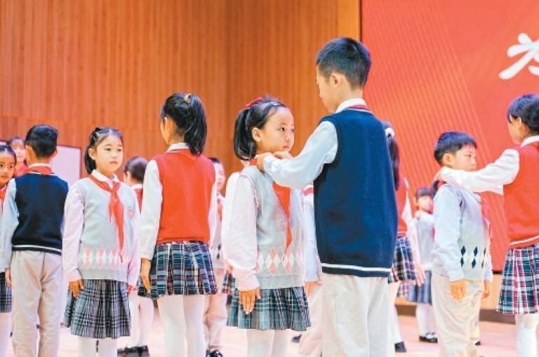少先隊(duì)老隊(duì)員為新隊(duì)員佩戴紅領(lǐng)巾。(受訪單位供圖)