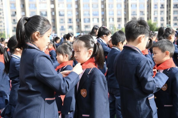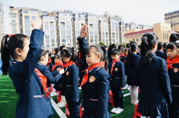 儀式上,老隊(duì)員為新隊(duì)員佩戴紅領(lǐng)巾,歡迎他們加入少先隊(duì)這個(gè)光榮的集體。新隊(duì)員們高舉右拳,莊嚴(yán)宣誓。朗誦《小號手》中,少先隊(duì)員們用激昂的語調(diào)重溫共產(chǎn)黨走過的崢嶸歲月;合唱《祖國有我》中,少先隊(duì)員們用稚嫩的歌聲訴說著“共產(chǎn)主義接班人”的責(zé)任與擔(dān)當(dāng)。