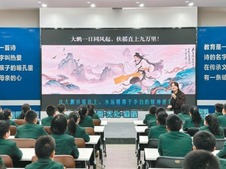 另一間教室里,王艷萍老師的晨誦課更顯靈動(dòng)。她時(shí)而模仿仗劍天涯的游俠步態(tài),時(shí)而以低沉嗓音演繹月下獨(dú)酌的孤寂,從《俠客行》的豪俠肝膽,到《將進(jìn)酒》的酣暢豪邁,隨著她的講述,一個(gè)立體而鮮活的李白形象走進(jìn)孩子心里。