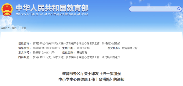 教育部辦公廳關(guān)于印發(fā)《進(jìn)一步加強(qiáng)中小學(xué)生心理健康工作十條措施》的通知