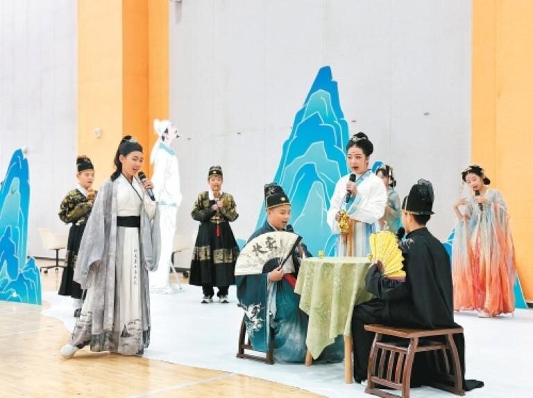 《行路難》的沉浸式演繹更讓觀眾共情:燈光暗下,朗誦者以赤誠嗓音復(fù)刻詩人從“冰塞川”的困頓到“濟(jì)滄?!钡陌簱P(yáng),背景水墨動畫鋪開黃河的冰封、太行的積雪,讓學(xué)子與千年前的李白對話,讀懂理想與堅(jiān)持?!洞航ㄔ乱埂穭t以古箏流水聲、水袖舞柔美、宣紙題詩交織,詩、樂、舞、書、誦同頻共振,立體呈現(xiàn)“春江潮水連海平”的盛唐之美。