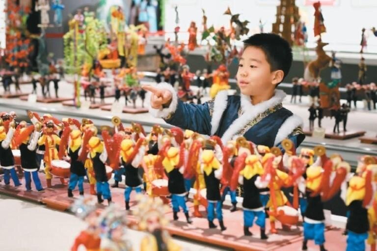 在民俗展上,王茁旭觀賞微縮社火模型。