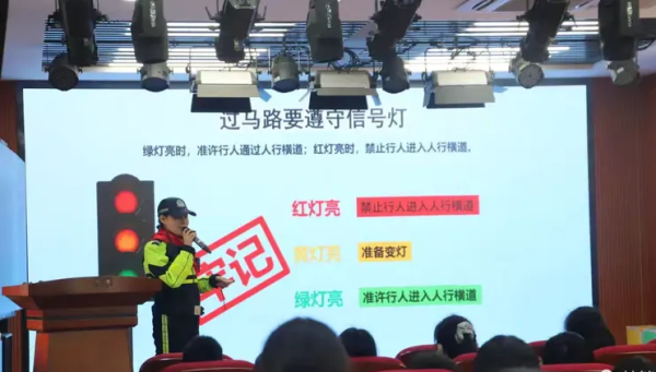 吳警官結(jié)合小學(xué)生的年齡特點(diǎn)和出行規(guī)律,圍繞步行安全與乘車安全主題,通過交通規(guī)則講解、案例視頻和互動問答等方式,將交通安全知識傳遞給每位學(xué)生。整場講座氣氛熱烈,同學(xué)們認(rèn)真聆聽、踴躍互動,紛紛表示,今后會自覺遵守交通法規(guī),知禮讓、守規(guī)則,當(dāng)好“家庭安全監(jiān)督員”,將安全知識帶回家。