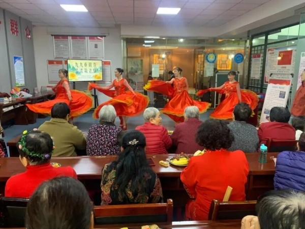 現(xiàn)場洋溢著喜慶的節(jié)日氛圍,老人們圍坐在一起閑話家常。藝術(shù)團首先帶來一場歡快熱烈的彩扇舞,演員們手持彩扇翩翩起舞,優(yōu)美的舞姿獲得陣陣掌聲。精彩多樣的節(jié)目不時獲得臺下觀眾的喝彩,重陽佳節(jié)的歡樂氛圍在社區(qū)活動室里達到頂峰。在重陽節(jié)這個尊老敬老的傳統(tǒng)節(jié)日里,社區(qū)用茶話會與文藝匯演活動為老人們送上了最美好的祝福。