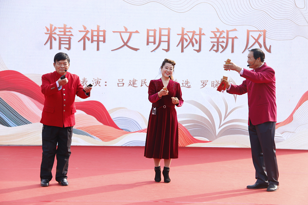 主題文藝演出環(huán)節(jié),傳統(tǒng)藝術與現(xiàn)代表演相得益彰?!掇r民畫,把中國的故事講給你聽》生動講述民間藝術背后的時代故事,展現(xiàn)農民畫獨特的藝術魅力;群口快板《精神文明樹新風》節(jié)奏明快、朗朗上口,唱響文明新風;戲歌《人面桃花》融合戲曲、非遺剪紙與傳統(tǒng)漢服之美,讓觀眾在傳統(tǒng)戲曲中感受重陽的文化韻味。