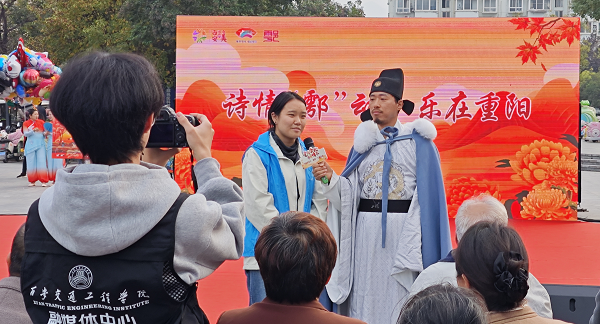 整場活動的高潮在“唐詩互動”中到來。當主持人問起重陽經典詩篇時,臺下觀眾齊聲誦讀“獨在異鄉(xiāng)為異客,每逢佳節(jié)倍思親!”話音未落,“詩仙李白”翩然登場。