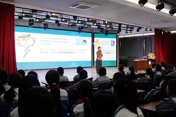 國網(wǎng)西安供電公司高級工程師、“陜西好人”張婷帶著她的“電寶夢工廠”走進了教室,帶來了趣味課堂《電寶和它的大鳥朋友》。她把知識都匯集成了一個個卡通形象,向同學們介紹了可愛又危險的“電寶”,以及在路旁站崗的“桿塔三兄弟”,以趣味方式幫助同學們了解“電”。