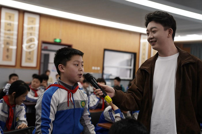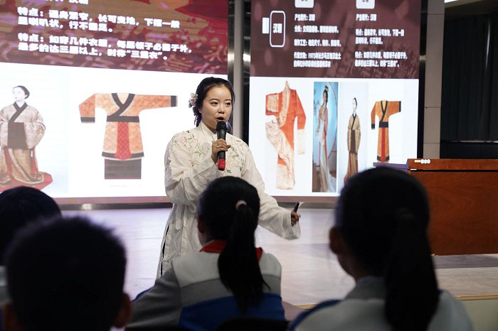 科普環(huán)節(jié)結束后,教室畫風一轉——西安市新時代文明實踐理論宣講師杉杉和子虞身著漢服登場,為孩子們帶來一場酣暢淋漓的對詩互動和詩詞鑒賞課堂。宣講嘉賓子虞把唐詩巧妙地拆解為“意、韻、情”三個維度,“‘意’是所見所聞、所思所感,是詩歌的根基?!弊佑葜v解道。從“不知細葉誰裁出”的春日生機,到“國破山河在”的家國情懷,詩詞課堂將唐詩拆解為可感知、可理解、可共情的內容,引導孩子們從詩句中讀懂詩人眼中的世界與心中的感悟。隨后,宣講嘉賓杉杉帶來漢服文化宣講,從定義、形制、結構、足衣首服等方面,系統(tǒng)介紹漢服知識,并展示漢、魏晉、唐、宋、明等朝代漢服特色,帶領學生領略傳統(tǒng)服飾之美。
