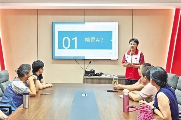 8月27日下午,在長(zhǎng)安區(qū)郭杜街道書苑社區(qū)活動(dòng)室,“青伴夕陽”項(xiàng)目志愿者介紹AI知識(shí)。(陜西日?qǐng)?bào))
