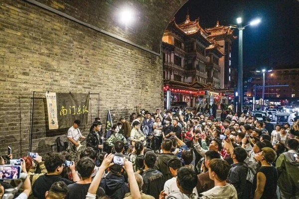 “吼一聲秦腔,神采飛揚,八百里秦川,盛世漢唐。八景八怪八河水,源源流淌,古色古香古長安,千秋耀光……”隨著南門樂隊主唱“寶哥”一聲秦腔般的嘶吼,護城河畔的空氣瞬間被點燃。城門洞里是揮舞著手機一起合唱的觀眾,城門洞外是燈火通明的永寧門。