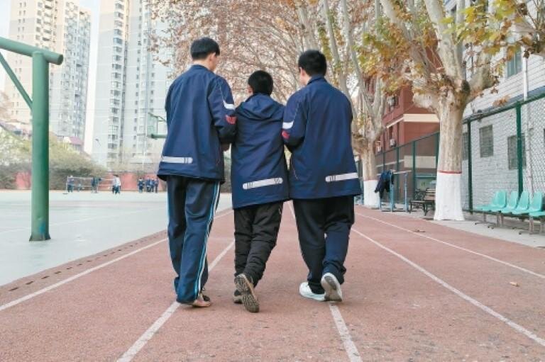 操場上,李同學(xué)(中)在學(xué)生志愿者的幫助下進(jìn)行步行訓(xùn)練。