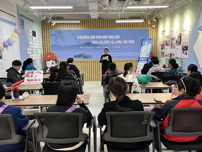 現(xiàn)場(chǎng)工作人員悉心指導(dǎo)居民朋友制作清明手作,將經(jīng)典唐詩(shī)《清明》題于作品之上,以巧手造物,以筆墨傳情。大家圍坐相伴、靜心創(chuàng)作,在手工與詩(shī)詞的交融中感受清明意蘊(yùn),讓敬意與溫情在指尖緩緩流淌。