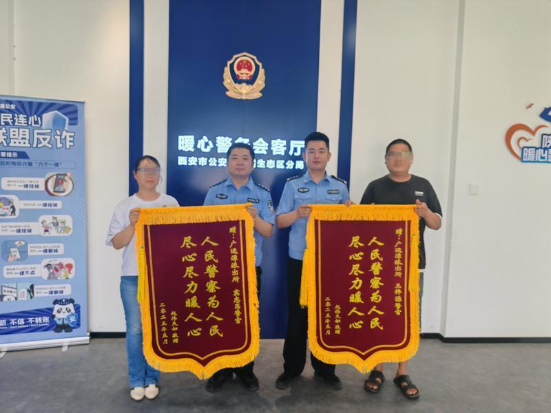 5月19日,市民趙先生夫婦來到西安市公安局浐灞分局廣運潭派出所西安國際會議中心暖心警務會客廳,鄭重地將兩面錦旗送給民警竇志昂和輔警王梓源,感謝他們幫助找回負氣離家出走的兒子。