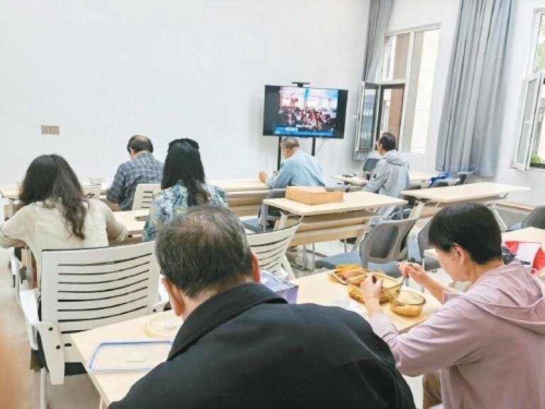 老人們?cè)谏鐓^(qū)食堂可以一邊吃飯一邊看電視。