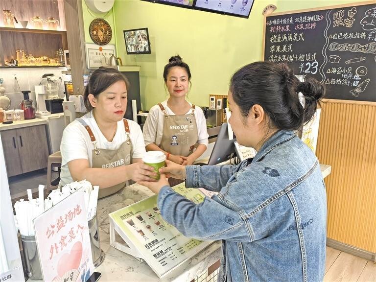 在興樂社區(qū)“愛無礙·靜默咖啡”咖啡館,何青(左一)將做好的咖啡遞給顧客(資料照片)。
