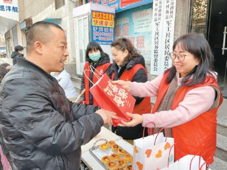 社區(qū)工作人員為戶外勞動者送上保暖禮包。(記者 閆鑫 攝)