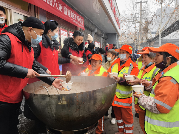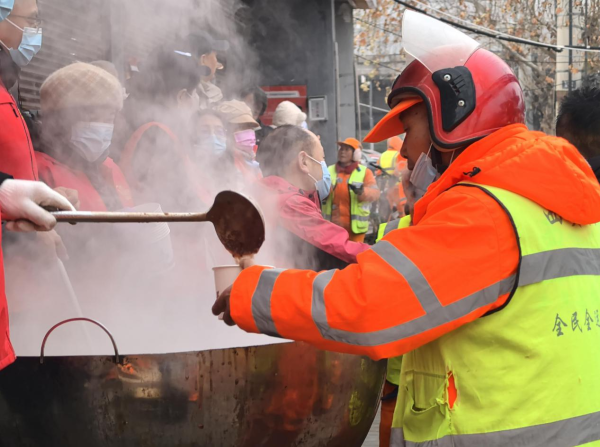 “吃了這碗粥,渾身都暖和了!”58歲的環(huán)衛(wèi)工人肖女士捧著粥,臉上笑意盈盈。她干環(huán)衛(wèi)工作已有13年,“每年臘八都有人惦記我們,很感動(dòng)。”剛?cè)胄邪肽甑狞h女士連聲稱贊:“真香!”一旁的李師傅接過(guò)粥,動(dòng)情地說(shuō):“你們昨天下午就開(kāi)始準(zhǔn)備,今天凌晨就起來(lái)熬粥,辛苦了!我們一定把城市環(huán)境打掃得更干凈,不辜負(fù)這份心意?!?/p>