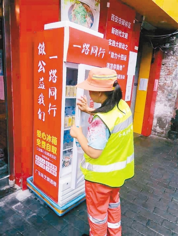“別著急,慢慢喝,你們辛苦了!”8月13日下午,西安東廳門一帶,餐館老板何卓遠正招呼著前來取用酸梅湯的環(huán)衛(wèi)工人師傅。記者看到,何先生在自家餐館門口設(shè)立的愛心冰箱內(nèi)有礦泉水和酸梅湯等飲品。冰箱旁貼著印有“助力十四運,清涼你我他”字樣的海報。冰箱一側(cè)張貼著“做公益我們一路同行,環(huán)衛(wèi)工人、公安交警、人民教師、醫(yī)護人員免費取用……”的文字?!斑@段時間天氣熱,一個多月前,老板就在餐館門口放了愛心冰箱?!杯h(huán)衛(wèi)工人秦師傅說,“大熱天里干完活,來這里喝點清涼的礦泉水或酸梅湯,解暑又解乏,老板真是個大好人!”