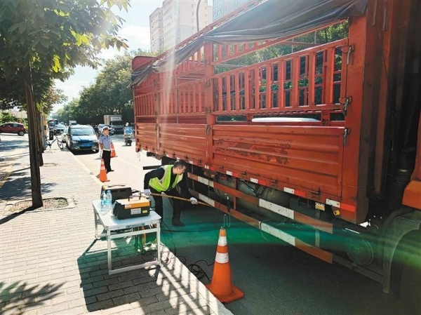 生態(tài)環(huán)境執(zhí)法人員聯(lián)合交警等部門對(duì)車輛進(jìn)行尾氣檢測(cè)。(記者 王旭東 攝)