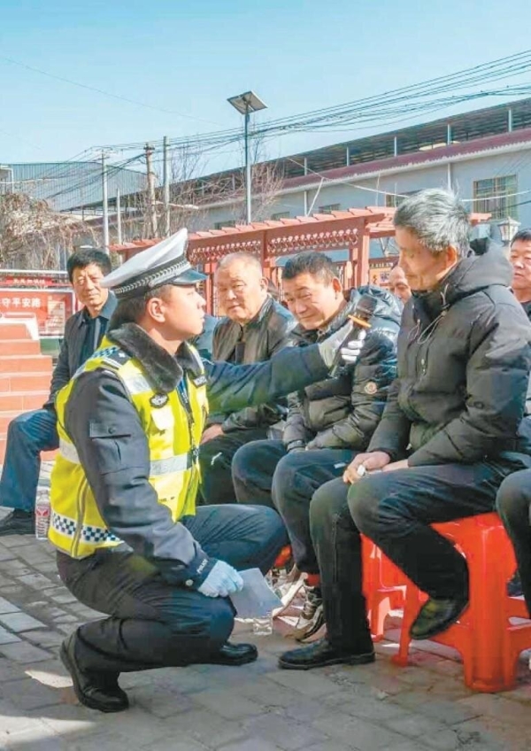 交警進(jìn)鄉(xiāng)村宣講交通安全常識(shí)。