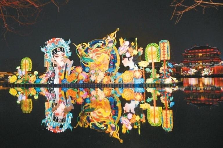 西安大唐芙蓉園內(nèi)芙蓉湖上的巨型花燈。(記者 郝鐘毓 攝)