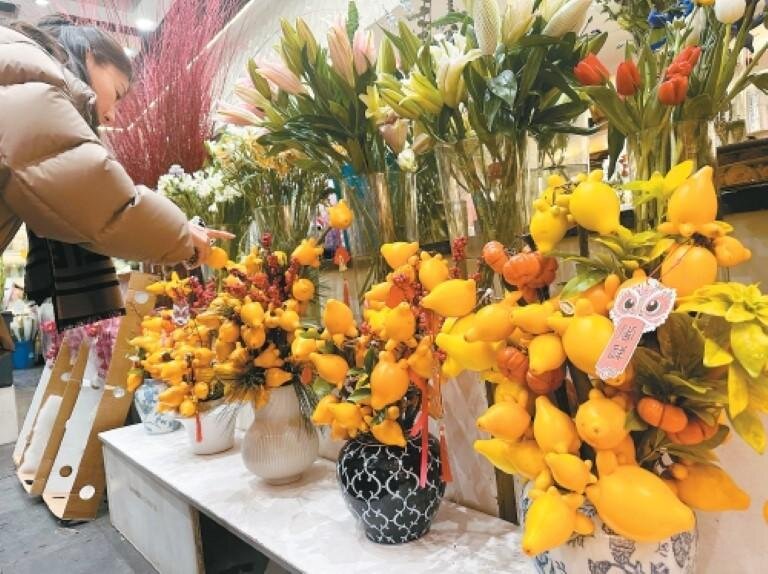 “這個(gè)黃色的果子是真的嗎?”“以前過(guò)年只買(mǎi)傳統(tǒng)年花,這個(gè)造型可愛(ài)又喜慶,一眼就喜歡上了”……市場(chǎng)里,幾處新式花卉攤位吸引不少市民前來(lái)觀賞,金黃飽滿的黃金果搭配鮮紅的北美冬青,造型亮眼,不少市民爭(zhēng)相購(gòu)買(mǎi)。