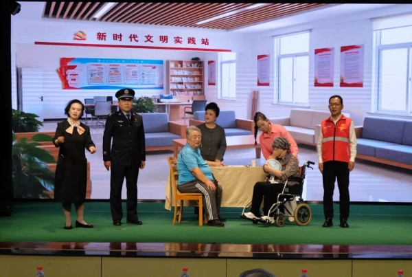 “咱們社區(qū)向來(lái)團(tuán)結(jié)互助,哪位居民朋友見(jiàn)到這位老人,請(qǐng)速和志愿者聯(lián)系?!痹凇扒厝酥恰钡赖碌湫托v團(tuán)帶來(lái)的原創(chuàng)情景劇《明朗的一天》中,一位老人走失,社區(qū)書記呼吁居民齊心協(xié)力尋找。
