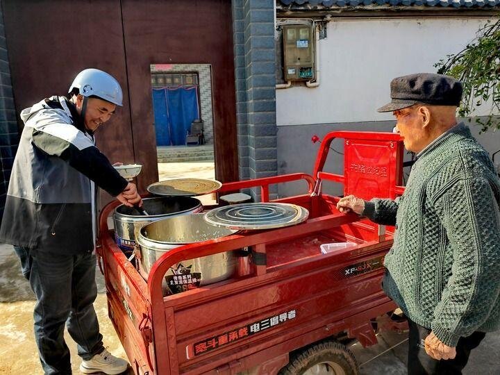 “晌午飯來咧,取碗!”在陜西省西安市藍田縣三官廟鎮(zhèn)里峪灣村,每當送飯的三輪車開到村民家門口時,“網(wǎng)紅”村支書龐富強就這樣吼一嗓子。有的老人一邊拿碗,一邊也喊出這句話回應他。采訪當天,一位路過的陌生司機特地放慢車速,朝著正在駕駛?cè)嗆嚨凝嫺粡姼呗曊泻簦骸吧挝顼垇磉郑⊥?!”龐富強被逗笑了,隨車采訪的我也被逗樂了。
