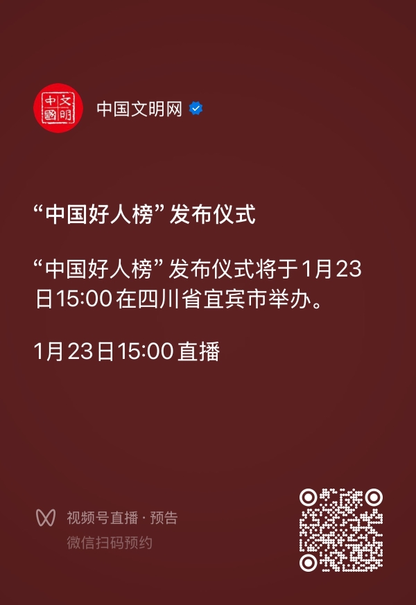 “中國好人榜”發(fā)布儀式將于1月23日15:00在四川省宜賓市舉辦。