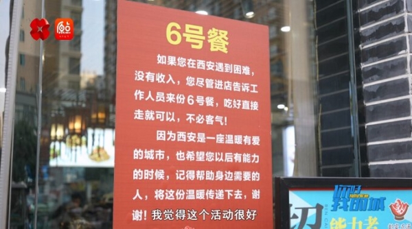 餐館門口的玻璃窗上,一張醒目的告示格外暖心:“如果您在西安遇到困難,沒有收入,您盡管進(jìn)店告訴工作人員來份6號餐,吃好直接走就可以,不必客氣!”這份不在菜單上的愛心套餐,是創(chuàng)始人彭成根與困境之人的默契暗號,更是他藏在煙火里的溫柔祝福。
