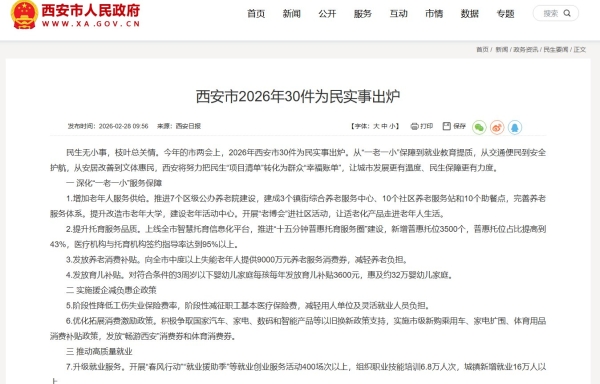 今年的市兩會上,2026年西安市30件為民實事出爐。從“一老一小”保障到就業(yè)教育提質(zhì),從交通便民到安全護(hù)航,從安居改善到文體惠民,西安將努力把民生“項目清單”轉(zhuǎn)化為群眾“幸福賬單”,讓城市發(fā)展更有溫度、民生保障更有力度。
