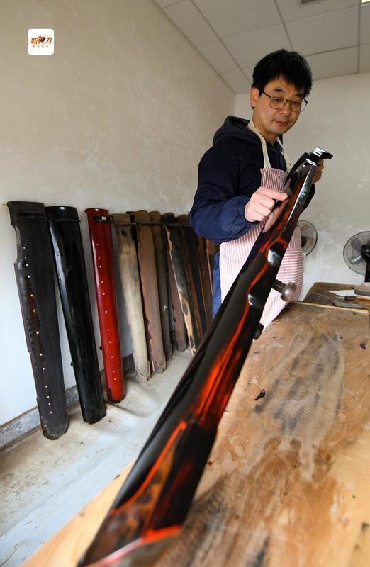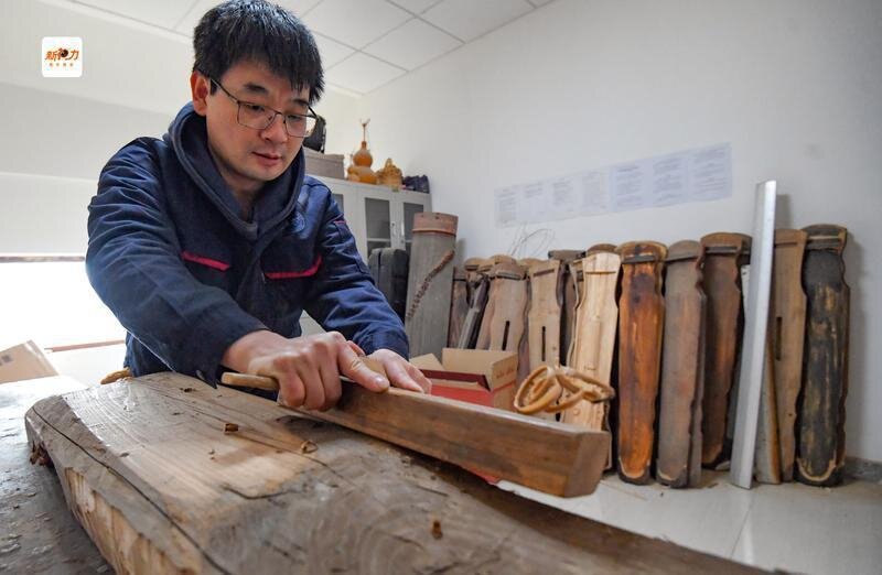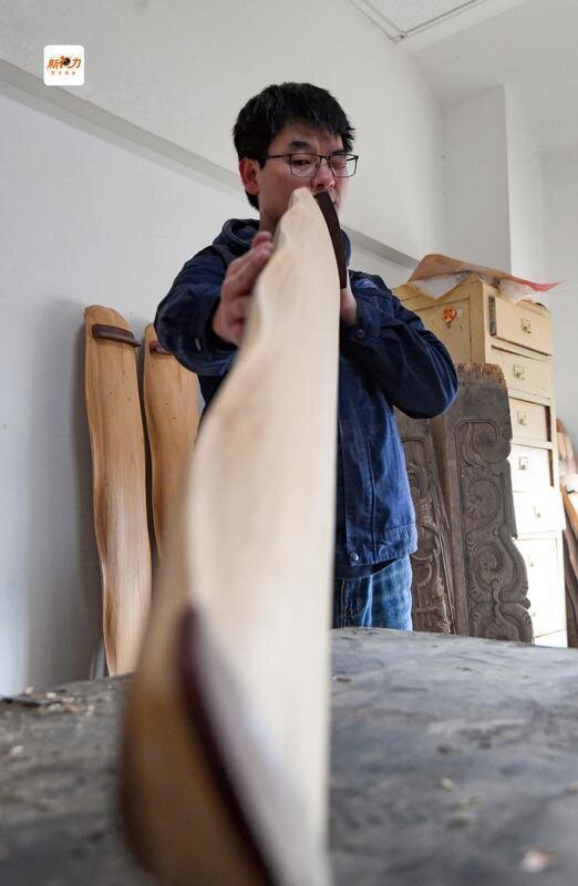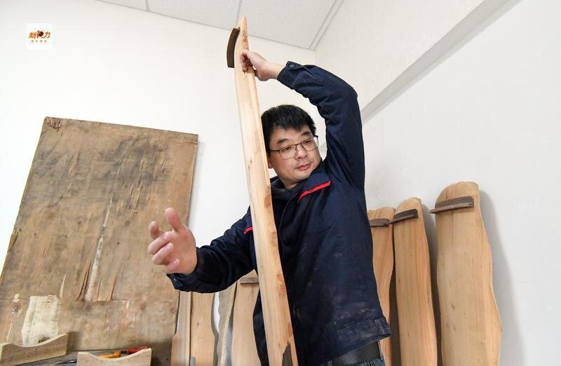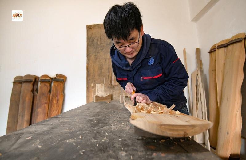 程剛正在工作室制作古琴。