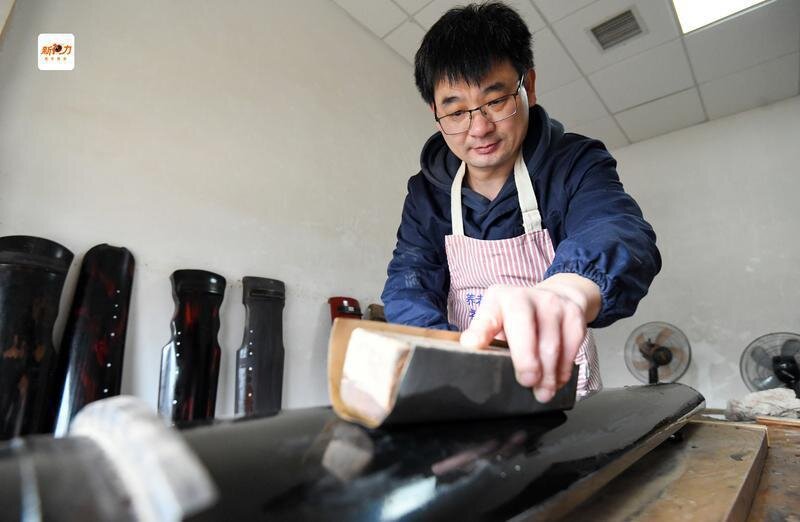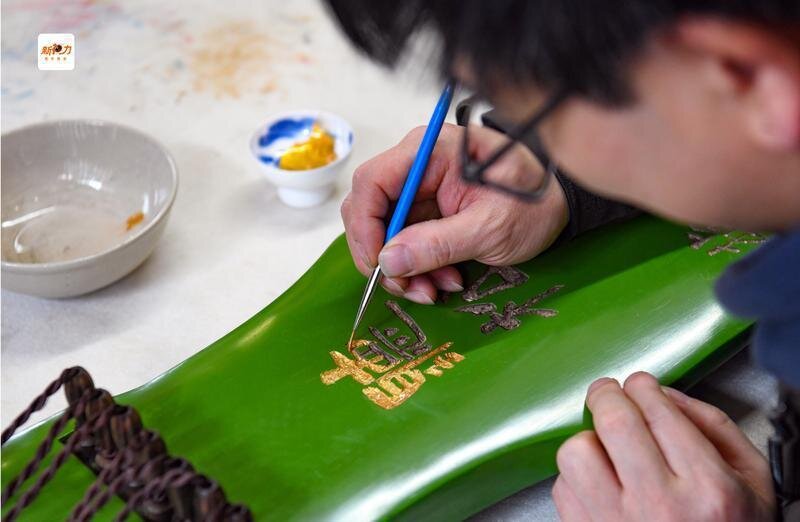 程剛正在為琴身刻字描金,為古琴增添古韻。