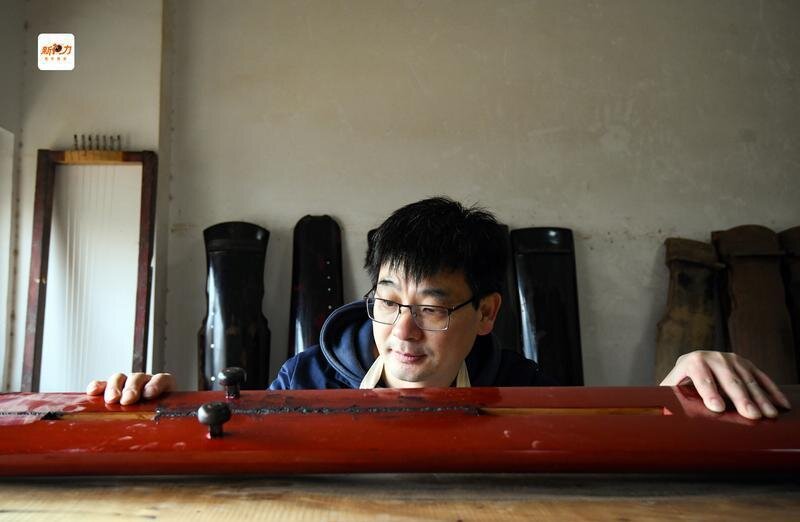 程剛檢查古琴面板。