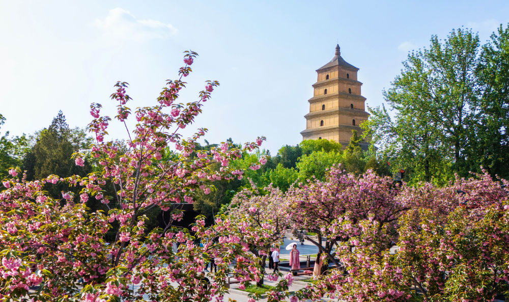 游客在西安大雁塔下游覽。新華社記者 鄒競一 攝
