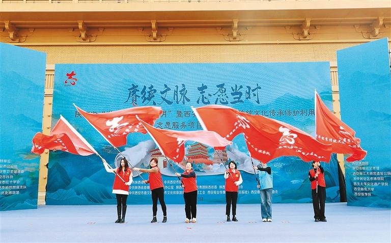 啟動(dòng)儀式上,領(lǐng)導(dǎo)嘉賓為陜西歷史博物館、西安博物院、西安關(guān)中民俗藝術(shù)博物院、西安市群眾藝術(shù)館、大明宮國(guó)家遺址公園以及西北大學(xué)文化遺產(chǎn)學(xué)院共6支“中華優(yōu)秀傳統(tǒng)文化傳承保護(hù)利用”志愿服務(wù)隊(duì)代表授旗。這些志愿服務(wù)隊(duì)伍將奔赴公益性文化服務(wù)現(xiàn)場(chǎng),以滿腔熱忱和專業(yè)技能“讓文物說話,讓歷史說話,讓文化說話”。