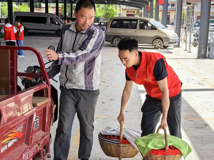 在休息的間隙,志愿者們還不忘維護(hù)市場(chǎng)秩序,幫忙疏導(dǎo)車輛,向來(lái)往 商客宣傳文明交通意識(shí),向老人宣傳防詐騙知識(shí)。在服務(wù)了6多小時(shí)后,大家早已汗流浹背,直到果農(nóng)的櫻桃妥善處理好了后,大家才結(jié)束志愿服務(wù)。